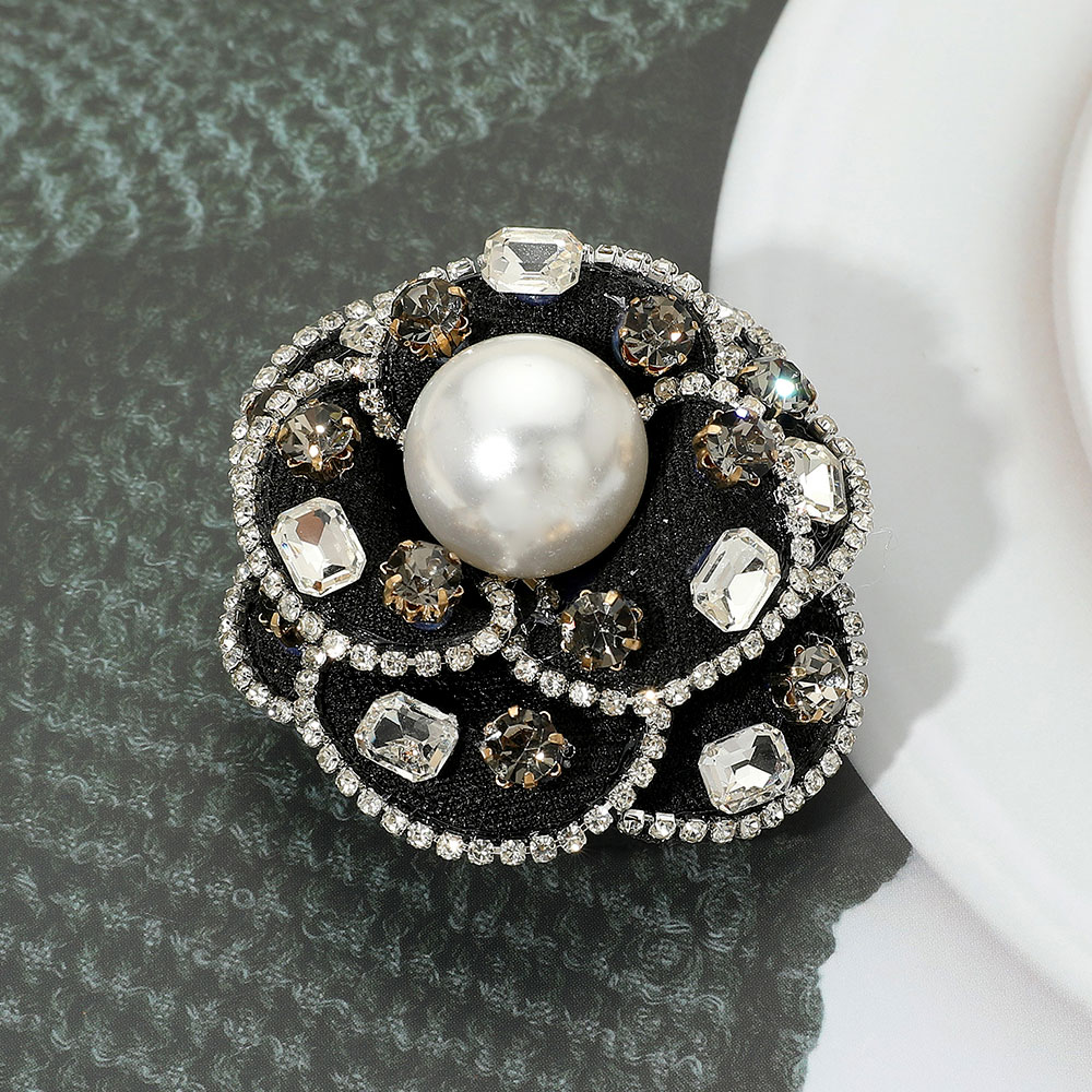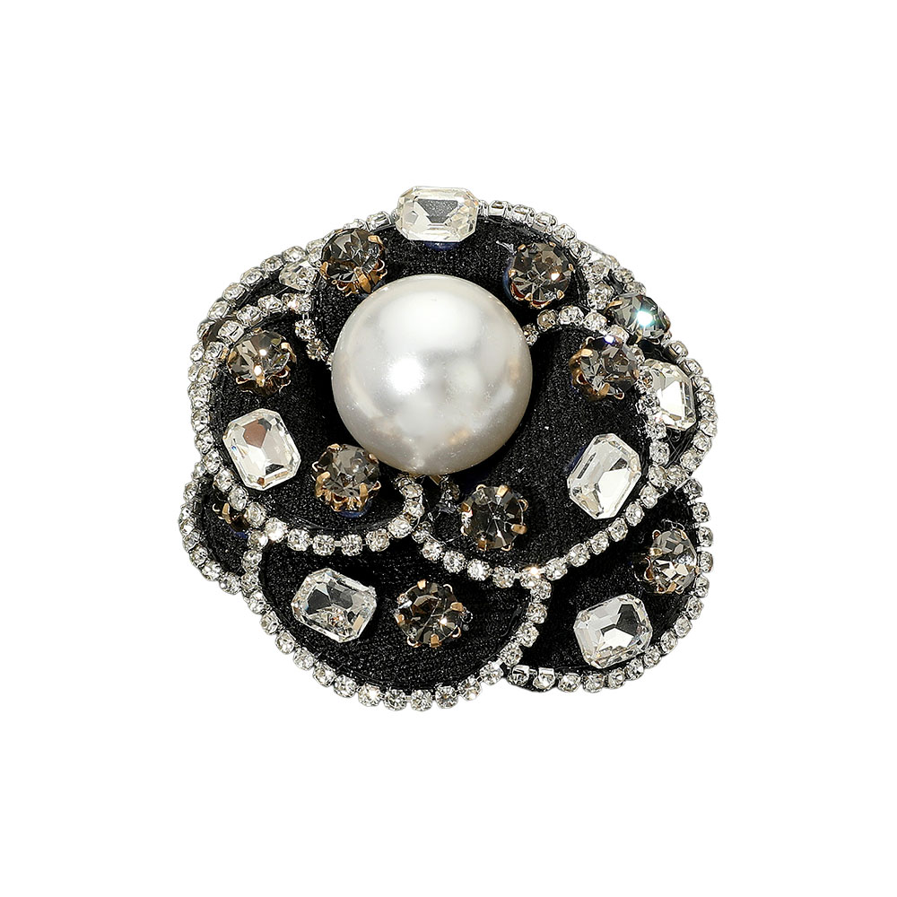 Details • Size : 2.25" X 2.25" • Dual : Brooch / Hair Pinch Clip • Luxurious flower brooch adorned with sparkling crystals and a central pearl accent, featuring a dual clip for versatile styling. Perfect for enhancing jackets, dresses, scarves, or handbags with elegance. • Lead and Nickel Compliant