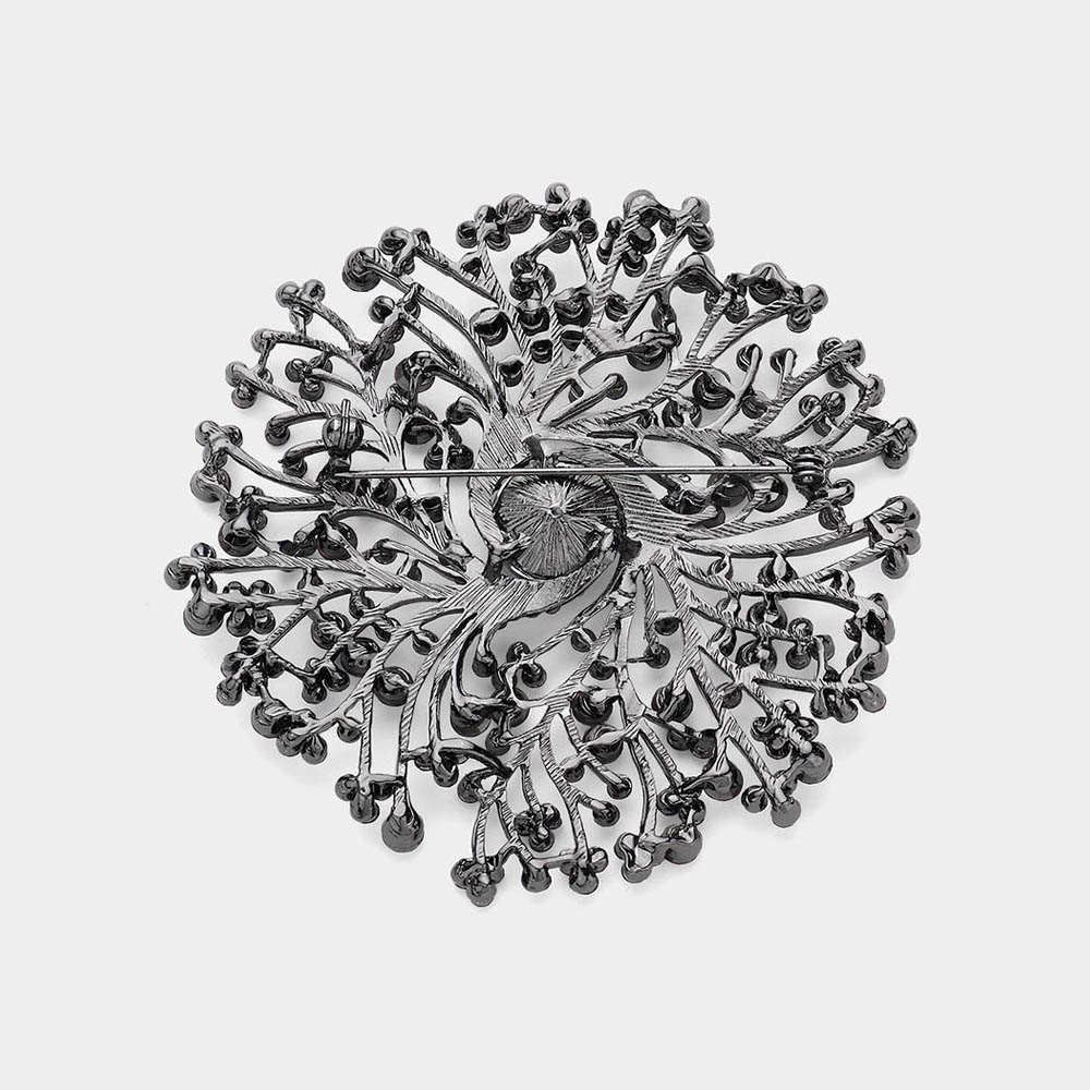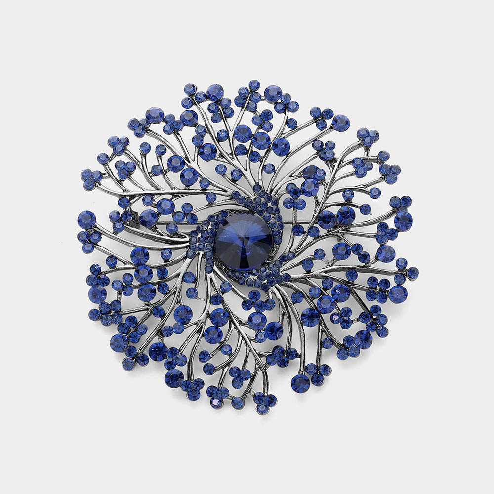 Round Stone Centered Rhinestone Embellished Branch Flower Pin Brooch