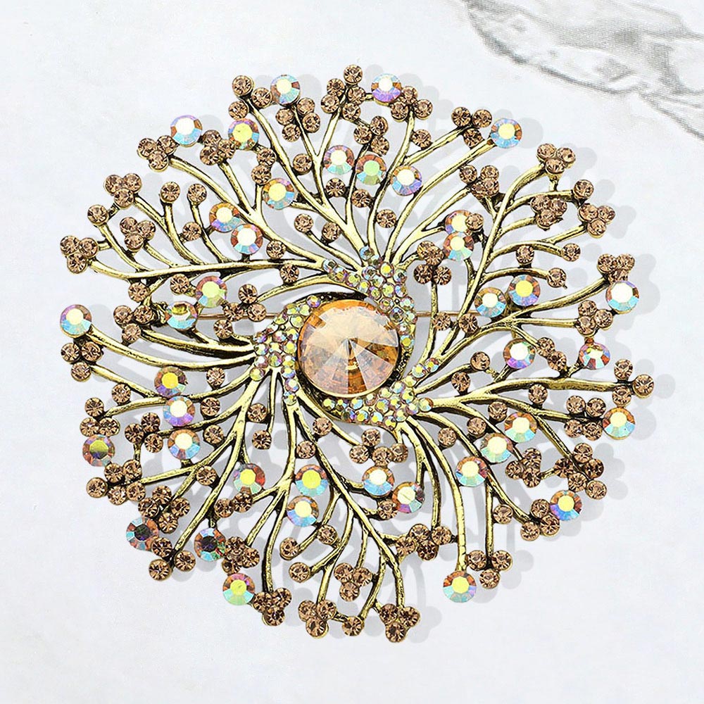 Round Stone Centered Rhinestone Embellished Branch Flower Pin Brooch