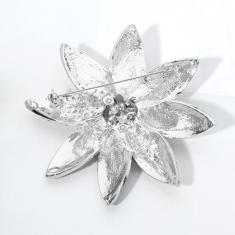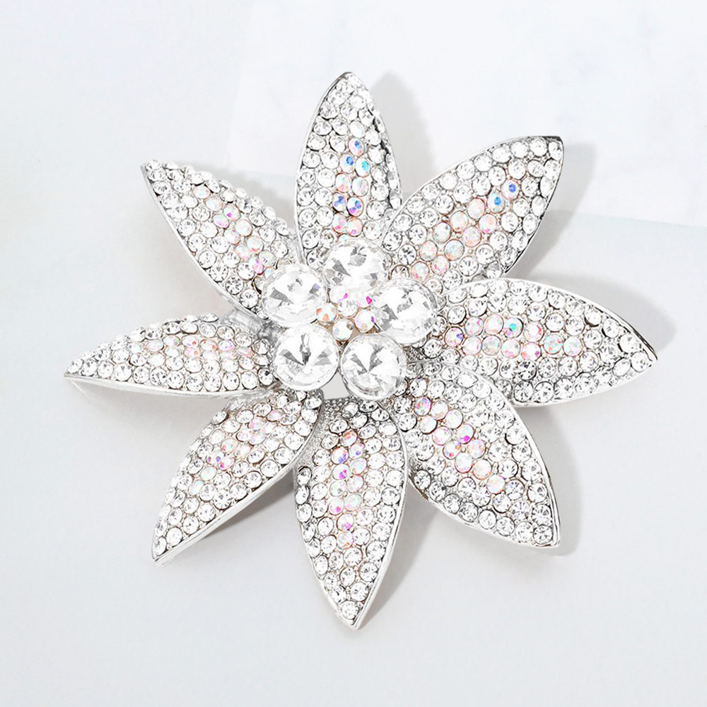 • Elegant floral brooch adorned with shimmering crystals arranged in a petal design. Perfect for adding a luxurious touch to coats, dresses, or scarves, this eye-catching accessory brings timeless glamour to any outfit.