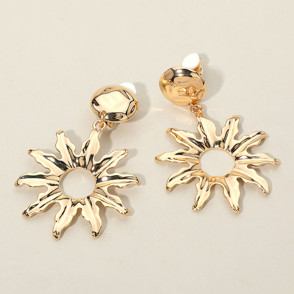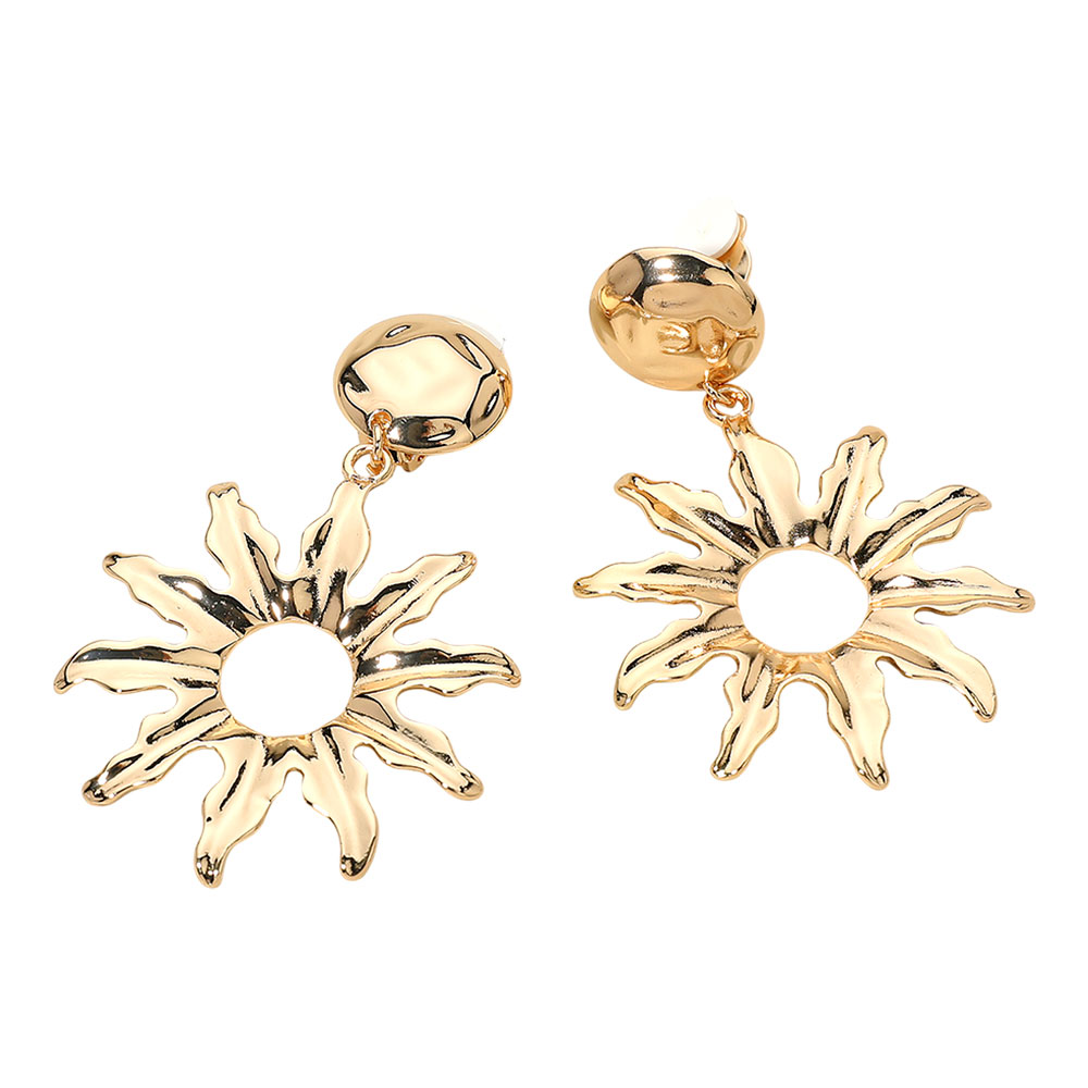 • Statement clip-on drop earrings featuring an abstract sunburst design with sculptural petal details. Lightweight and comfortable for non-pierced ears, these eye-catching earrings add artistic flair to everyday looks, resort wear, or special occasion styling.