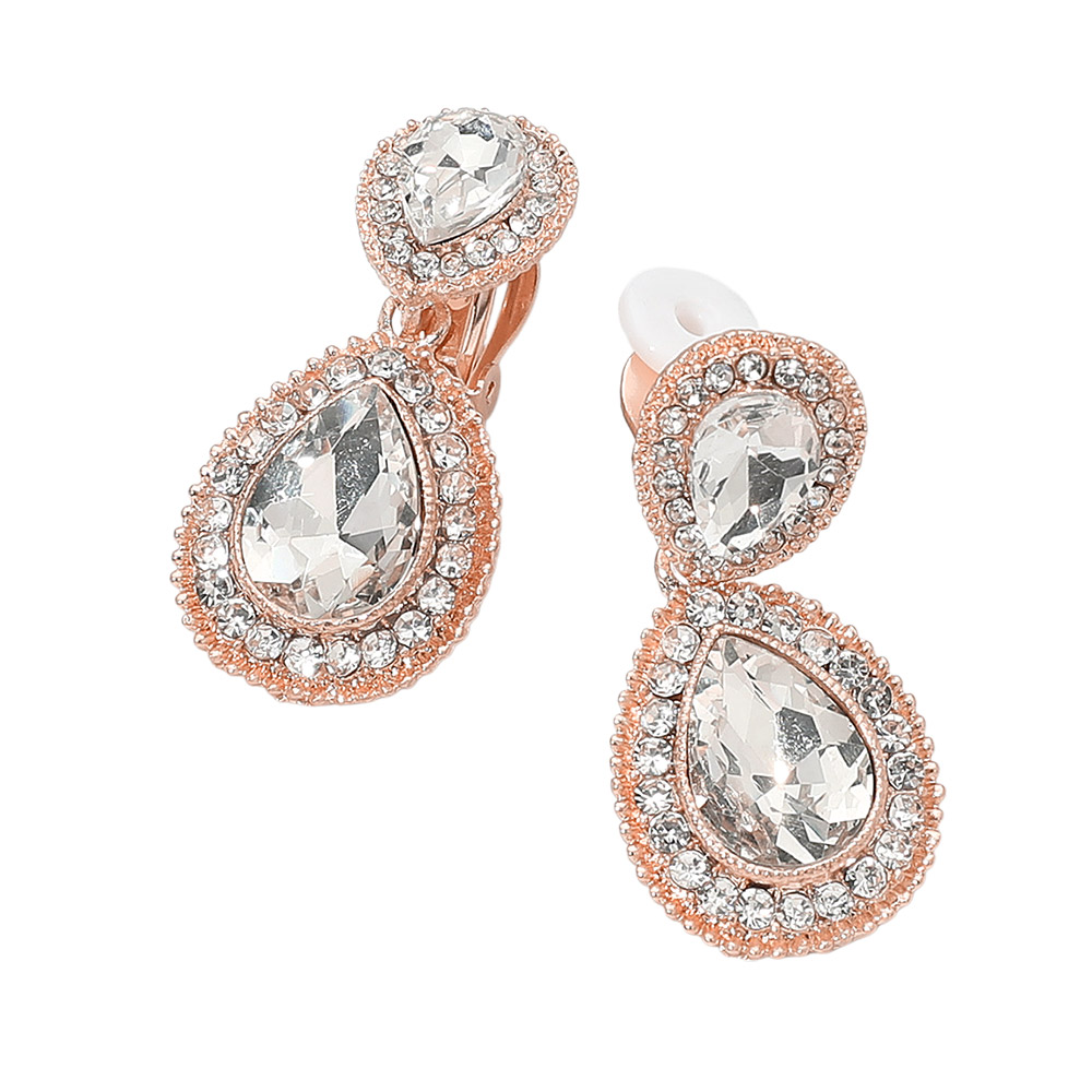 • These Teardrop Crystal Clip Earrings feature dazzling faceted stones framed by a halo of shimmering accents for an elegant and timeless look. Designed for comfort and sophistication, they add a touch of sparkle to any outfit, perfect for formal occasions or evening wear.