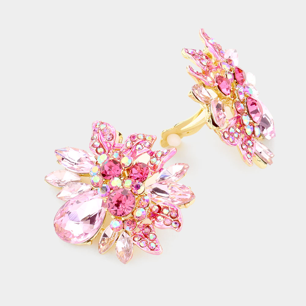 Flower Accented Triple Marquise Stone Link Dangle Evening Earrings