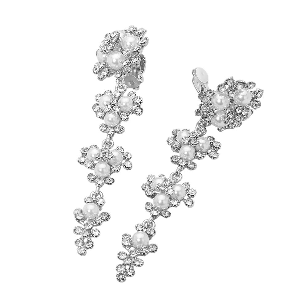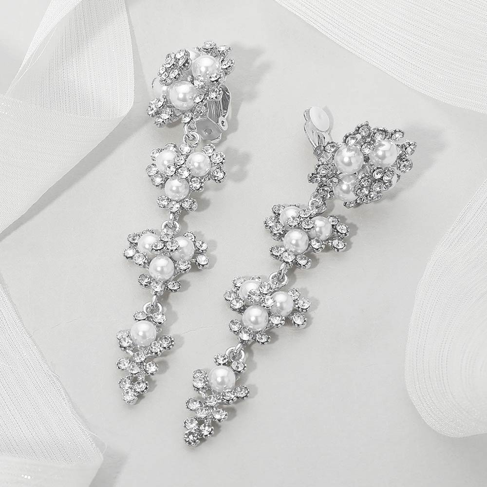 Details • Size : 1" X 3.8" • Clip On • Stunning floral drop clip on earrings featuring layered pearls and sparkling rhinestones. Lightweight yet bold design perfect for weddings, parties, or elevating everyday outfits. Comfortable post-back fit. • Lead and Nickel Compliant