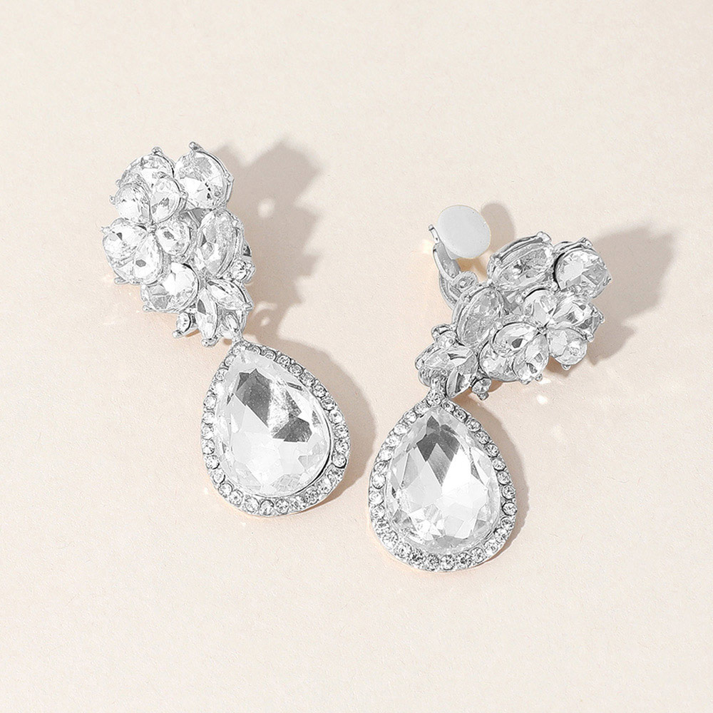 • These Floral Cluster Teardrop Crystal Clip Earrings feature a dazzling floral arrangement paired with teardrop-shaped stones. Designed for elegance and comfort, they add a radiant touch to any outfit, making them ideal for evening events, parties, or special celebrations.
