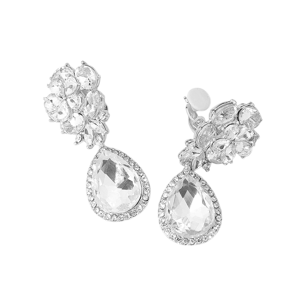 Flower Glass Crystal Teardrop Dangle Clip On Earrings Flower Glass Crystal Teardrop Dangle Clip On Earrings