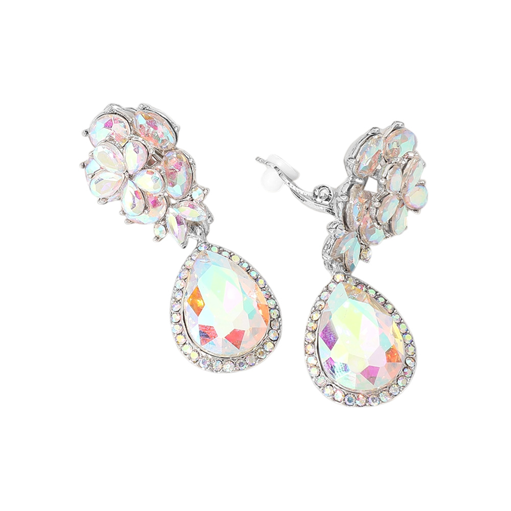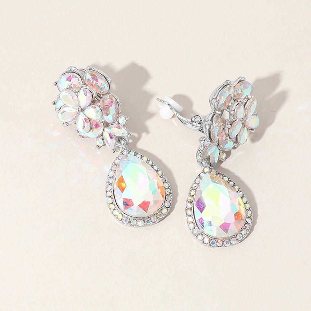 Flower Glass Crystal Teardrop Dangle Clip On Earrings Flower Glass Crystal Teardrop Dangle Clip On Earrings
