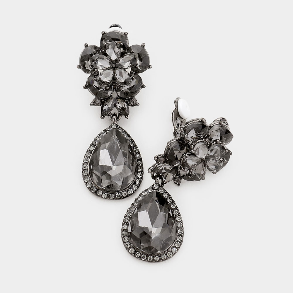 Flower Glass Crystal Teardrop Dangle Clip On Earrings