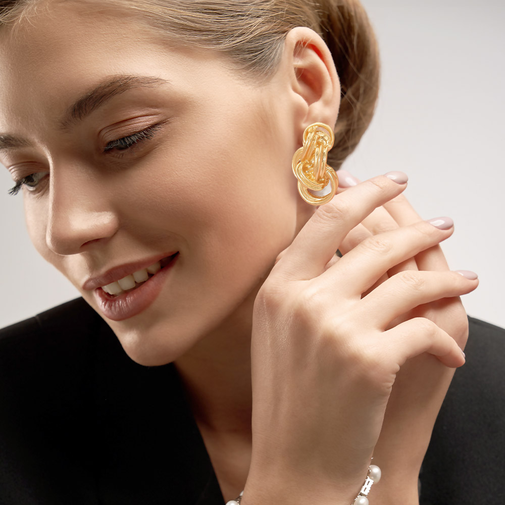 • These textured knot clip-on earrings blend modern artistry with timeless elegance. The intricate interwoven design adds depth and dimension, making them a chic statement piece for any occasion. Comfortable and stylish, they offer a polished finish without the need for piercings.