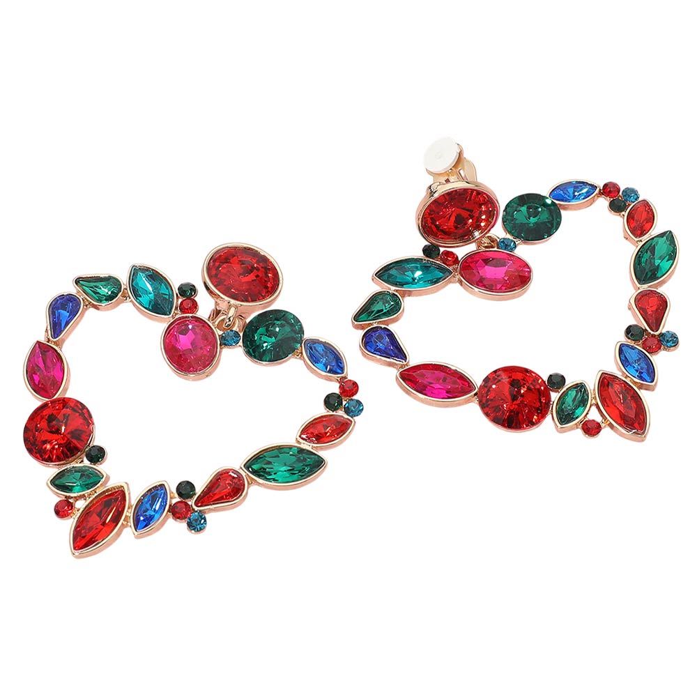 • These statement clip earrings feature a bold open-heart design accented with faceted crystals for eye-catching shine. Crafted to deliver dramatic impact without pierced ears, they offer secure clip-on comfort and elevated style. Ideal for special events, parties, or glam styling, these hoops bring instant polish and standout appeal to any jewelry collection while remaining lightweight and easy to wear.