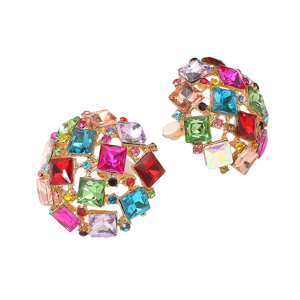 Square Stone Cluster Embellished Dome Evening Clip On Earrings