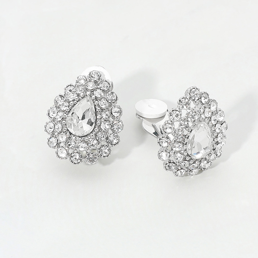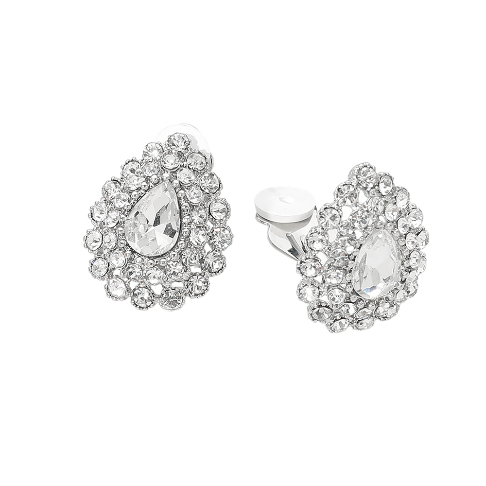 • Crystal teardrop cluster clip earrings featuring a classic halo-inspired design that adds instant elegance to any look. Designed for comfortable, secure wear without piercings, perfect for special occasions or elevated everyday styling. Ideal for boutiques seeking timeless, dressy statement earrings with refined appeal.