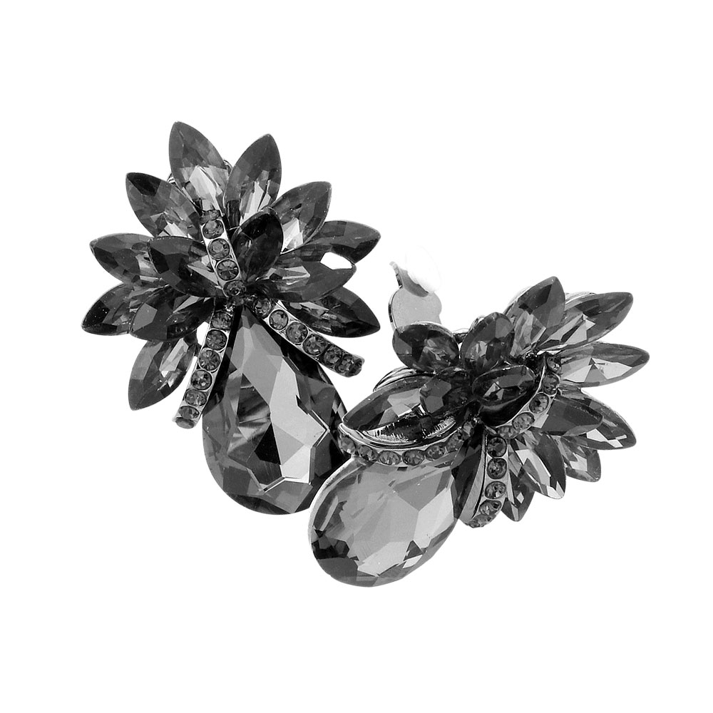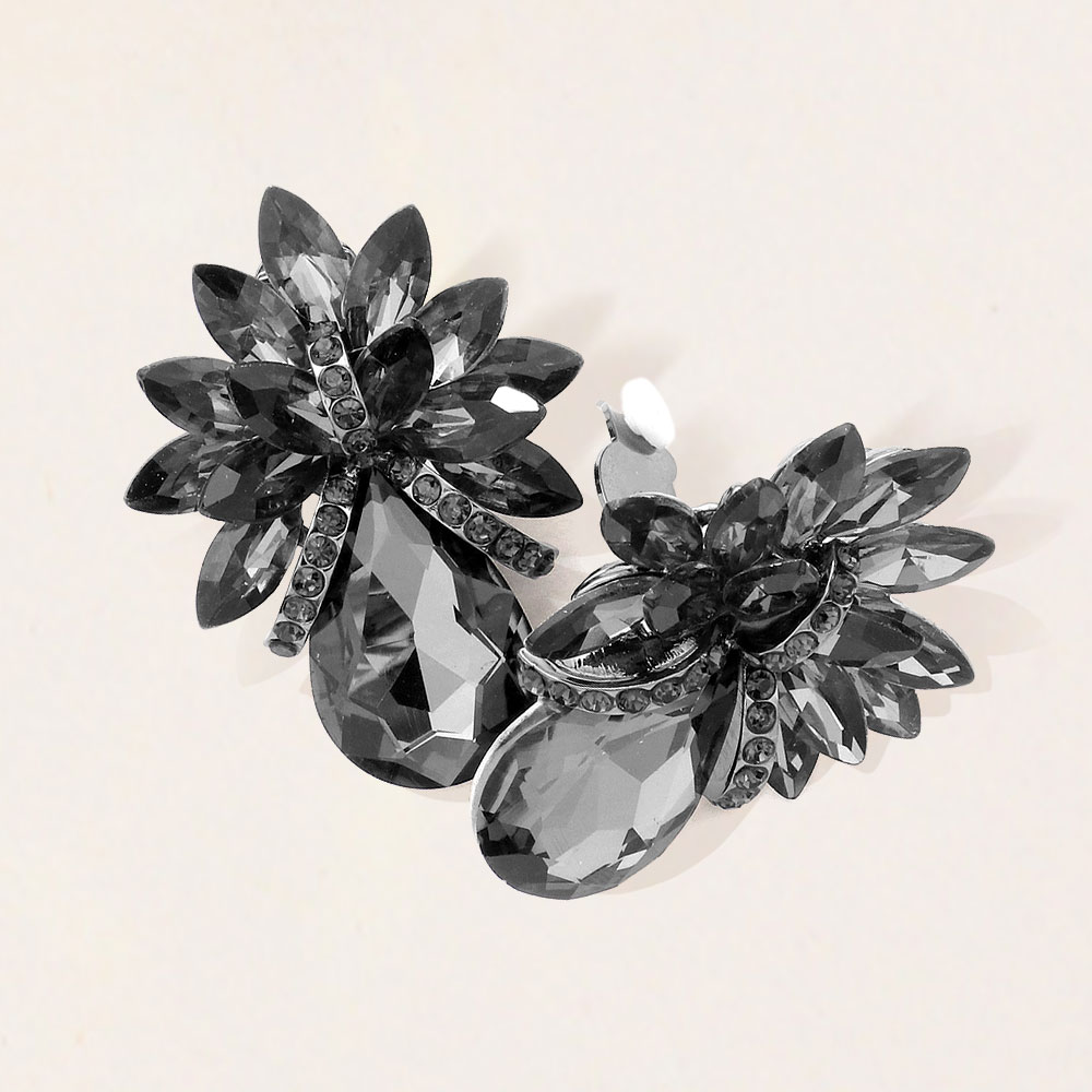 Details • Size : 1.75" X 2.25" • Clip On • Stunning clip-on earrings designed with a leaf cluster arrangement and dazzling crystal accents. These bold statement earrings add a glamorous touch to any outfit, perfect for parties, weddings, and evening events where timeless sophistication meets modern sparkle.