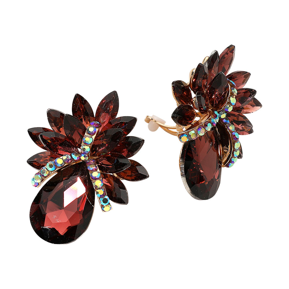 Details • Size : 1.75" X 2.25" • Clip On • Stunning clip-on earrings designed with a leaf cluster arrangement and dazzling crystal accents. These bold statement earrings add a glamorous touch to any outfit, perfect for parties, weddings, and evening events where timeless sophistication meets modern sparkle.