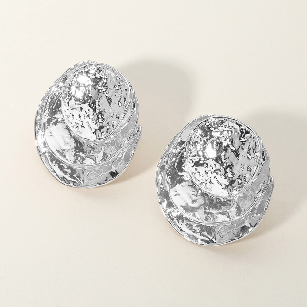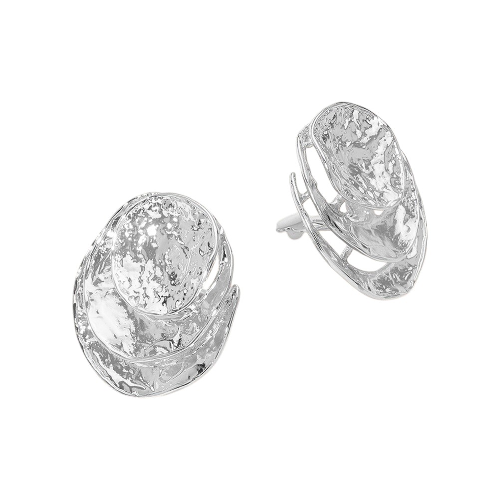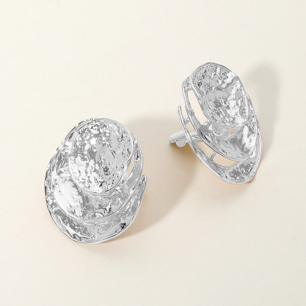 Details • Size : 1.6" X 1.6" • Clip On • Bold textured clip-on statement earrings featuring an abstract layered design with a polished finish. Perfect for non-pierced ears, these earrings combine comfort and modern artistry, making them a standout accessory for elevating everyday outfits or evening looks. • Lead and Nickel Compliant