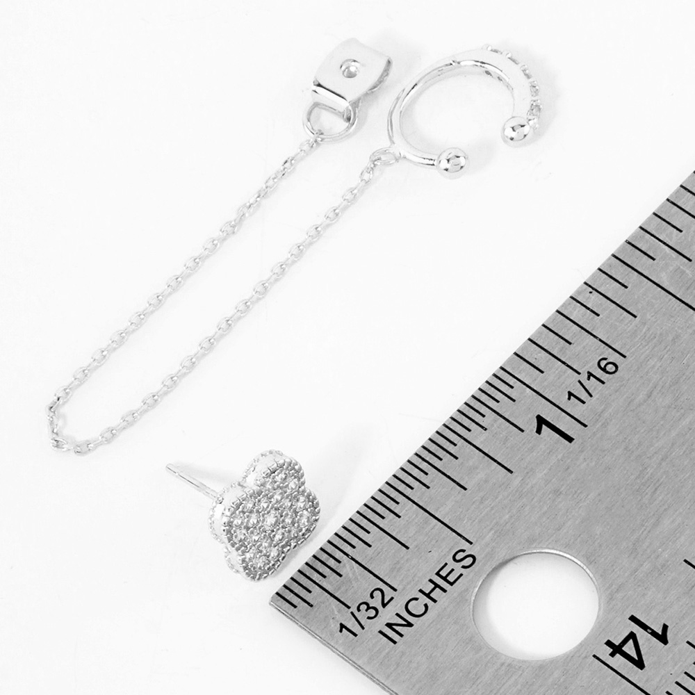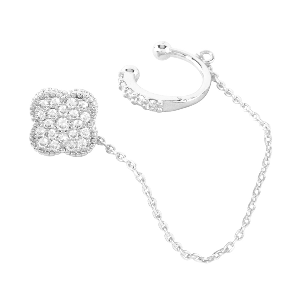White Gold Dipped CZ Stone Paved Quatrefoil Accent Chain Ear Cuff Earrings