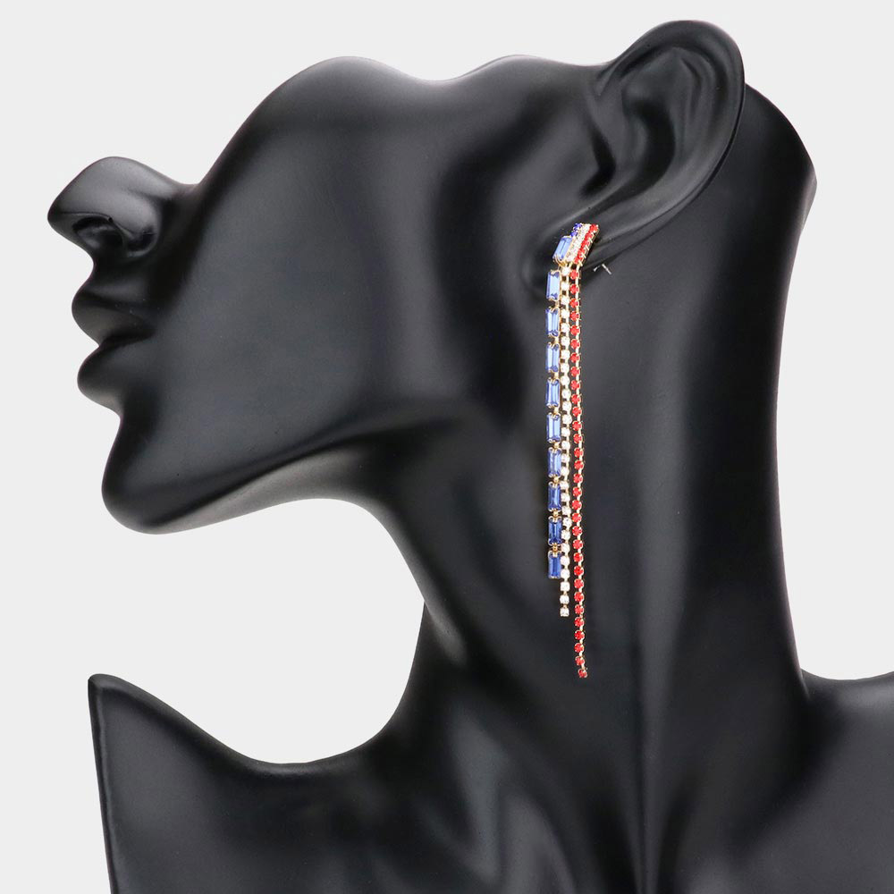 American USA Flag Dropped Rhinestone Dangle Evening Earrings