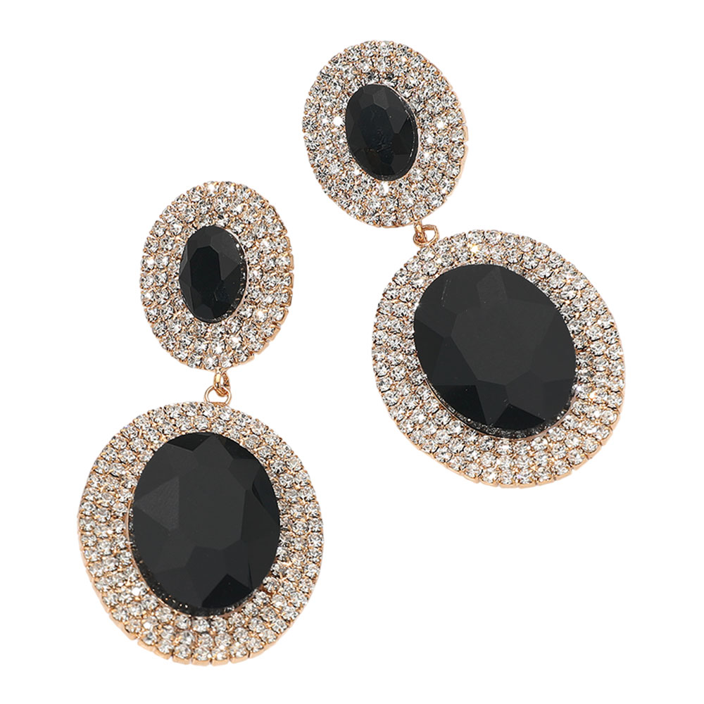 Details • Size : 1.4" X 2.8" • Post Back • Glamorous double oval drop earrings featuring faceted stones framed by shimmering pave halos. Perfect for weddings, parties, evening events or adding show-stopping sparkle to any outfit. A statement accessory with radiant, eye-catching elegance. • Lead and Nickel Compliant