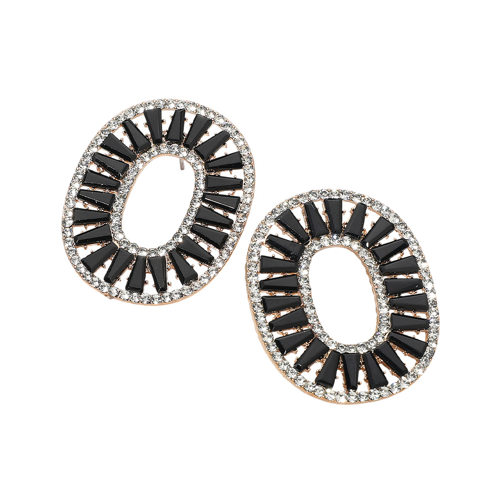 • Turn heads with these stunning oval-shaped earrings featuring a striking geometric crystal arrangement and sparkling accent border. Their bold, elegant style adds instant glamour to evening looks, making them the perfect choice for formal events or festive occasions.