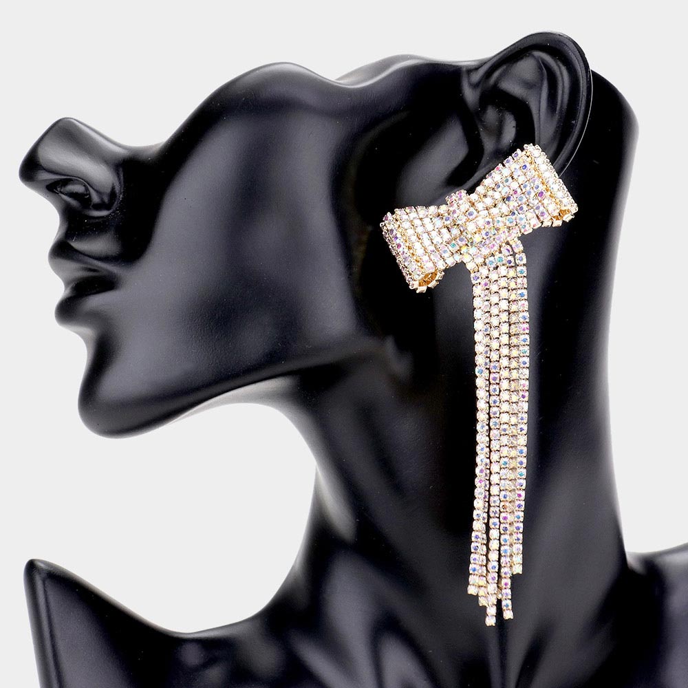 Bow Accented Rhinestone Long Drop Evening Earrings