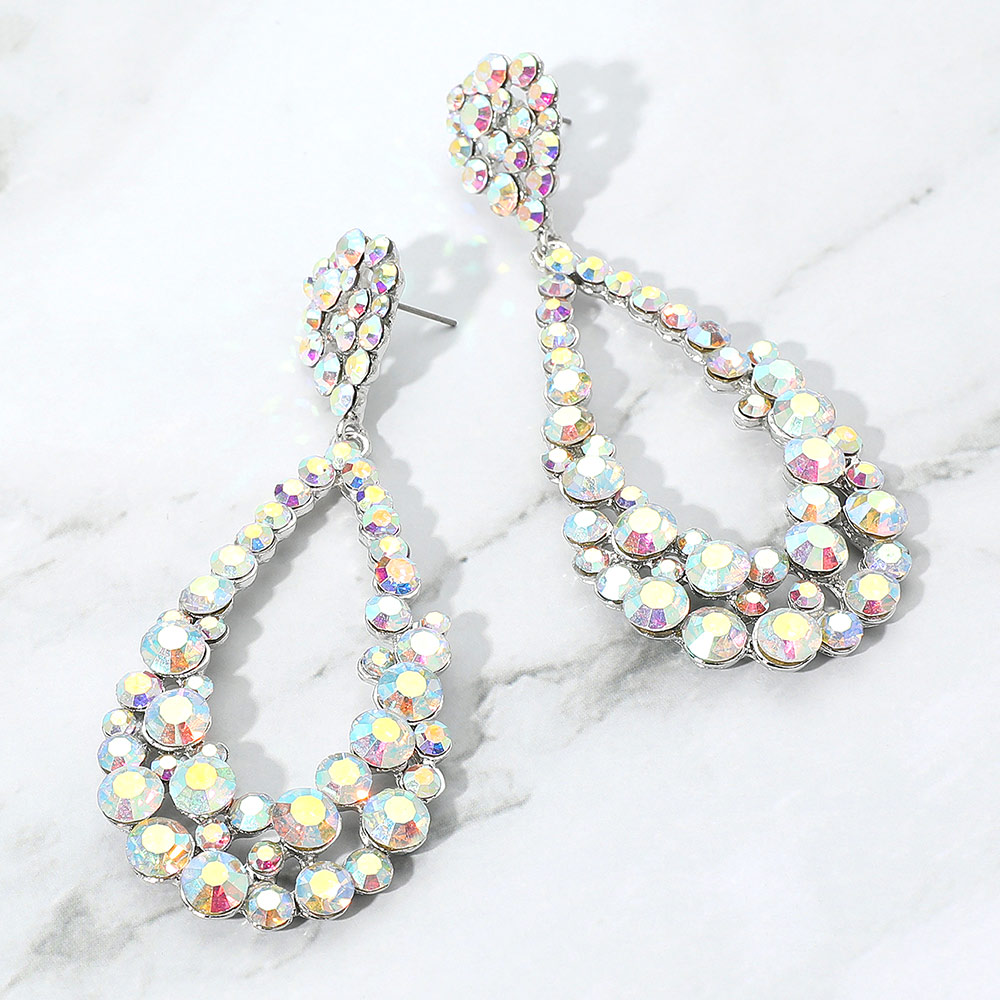 • Elegant teardrop crystal earrings featuring double-layered rhinestones. Perfect for weddings, proms, or evening events. Lightweight, eye-catching design for a glamorous finishing touch.