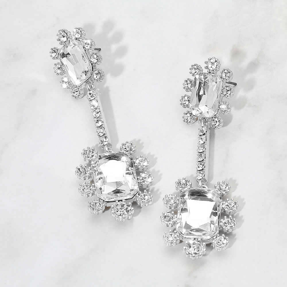 Details • Size : 0.8" X 3" • Post Back • Sophisticated drop earrings featuring radiant crystals and delicate floral-inspired halos. A timeless accessory perfect for weddings, evening events, or formal wear. • Lead and Nickel Compliant