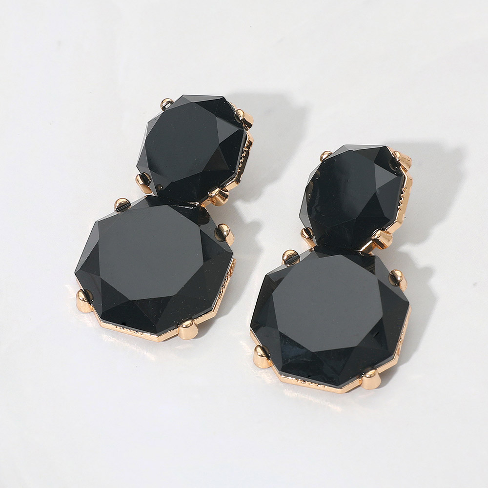 • These faceted double gem drop earrings feature a striking octagonal design that reflects light with every movement. Their elegant, layered silhouette adds a refined touch, making them a standout accessory for both casual and formal occasions.