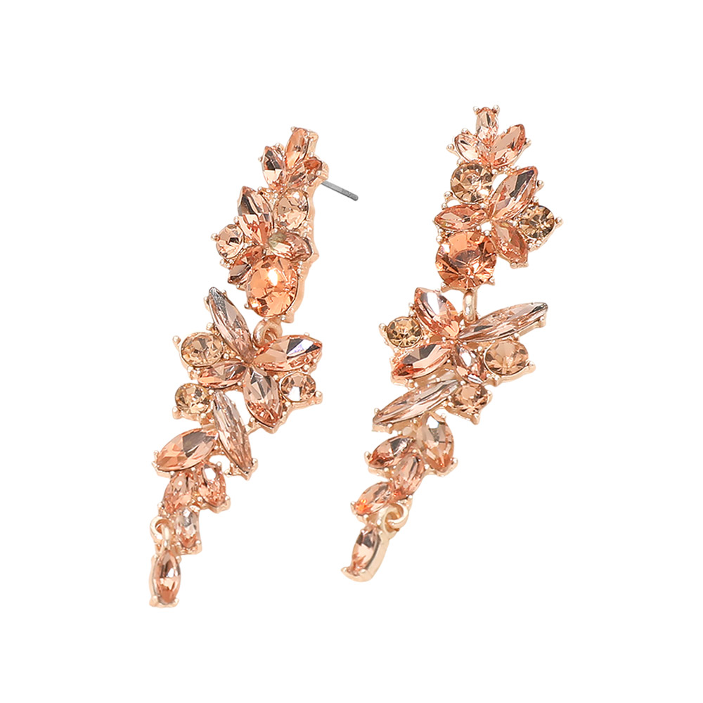 Details • Size : 0.7" X 2.4" • Post Back • These floral cluster drop statement earrings feature a cascading arrangement of faceted stones in an elegant vertical silhouette. Designed to create eye-catching movement and refined sparkle, they add dramatic impact while remaining graceful. Ideal for evening events, weddings, parties, and elevated everyday styling, making them a standout addition to any fashion jewelry collection. • Lead and Nickel Compliant