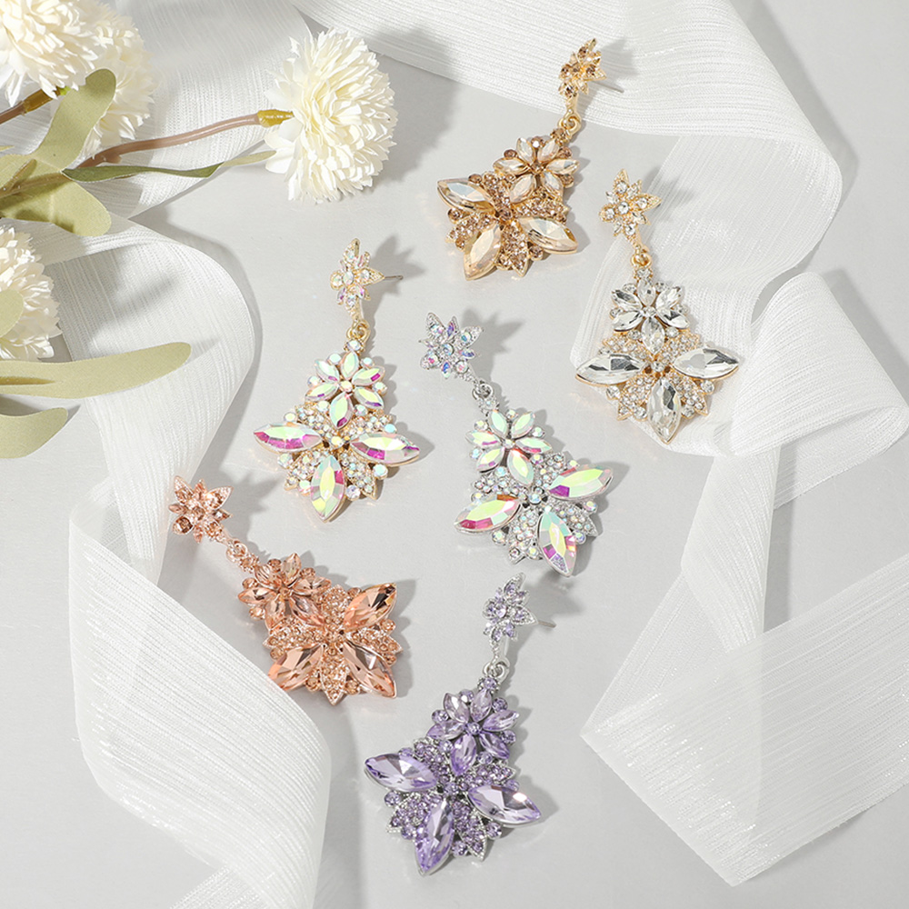 Details • Size : 1.4" X 2.75" • Post Back • Radiate elegance with these floral crystal drop earrings featuring a stunning cluster of faceted stones in a dazzling flower design. Ideal for weddings, galas, or celebrations, these statement earrings add a glamorous finishing touch to elevate your evening or bridal look. • Lead and Nickel Compliant