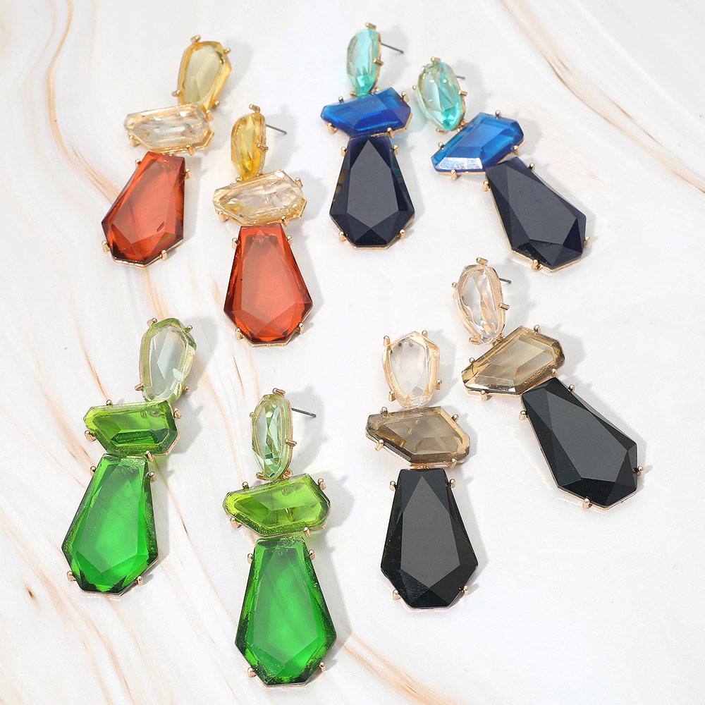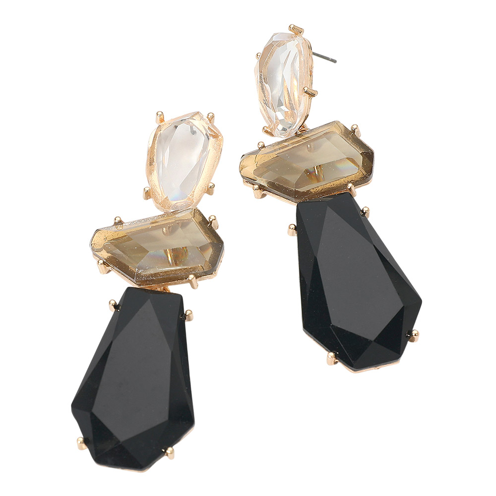• Make a bold statement with these geometric three-stone drop earrings. Featuring an artful mix of faceted stones in a modern tiered design, they capture light beautifully for an effortlessly elegant look. Perfect for adding sophistication and drama to any outfit.