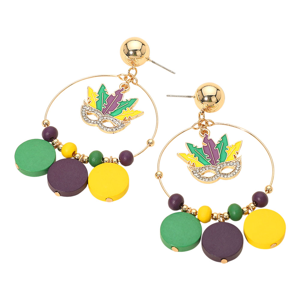 Details • Size : 1.75" X 3" • Post Back • Festive Mardi Gras hoop earrings featuring a playful mask charm and round bead accents. Lightweight statement design perfect for themed celebrations, parties, and costume looks. Adds fun seasonal flair to any outfit for parade and event styling. • Lead and Nickel Compliant