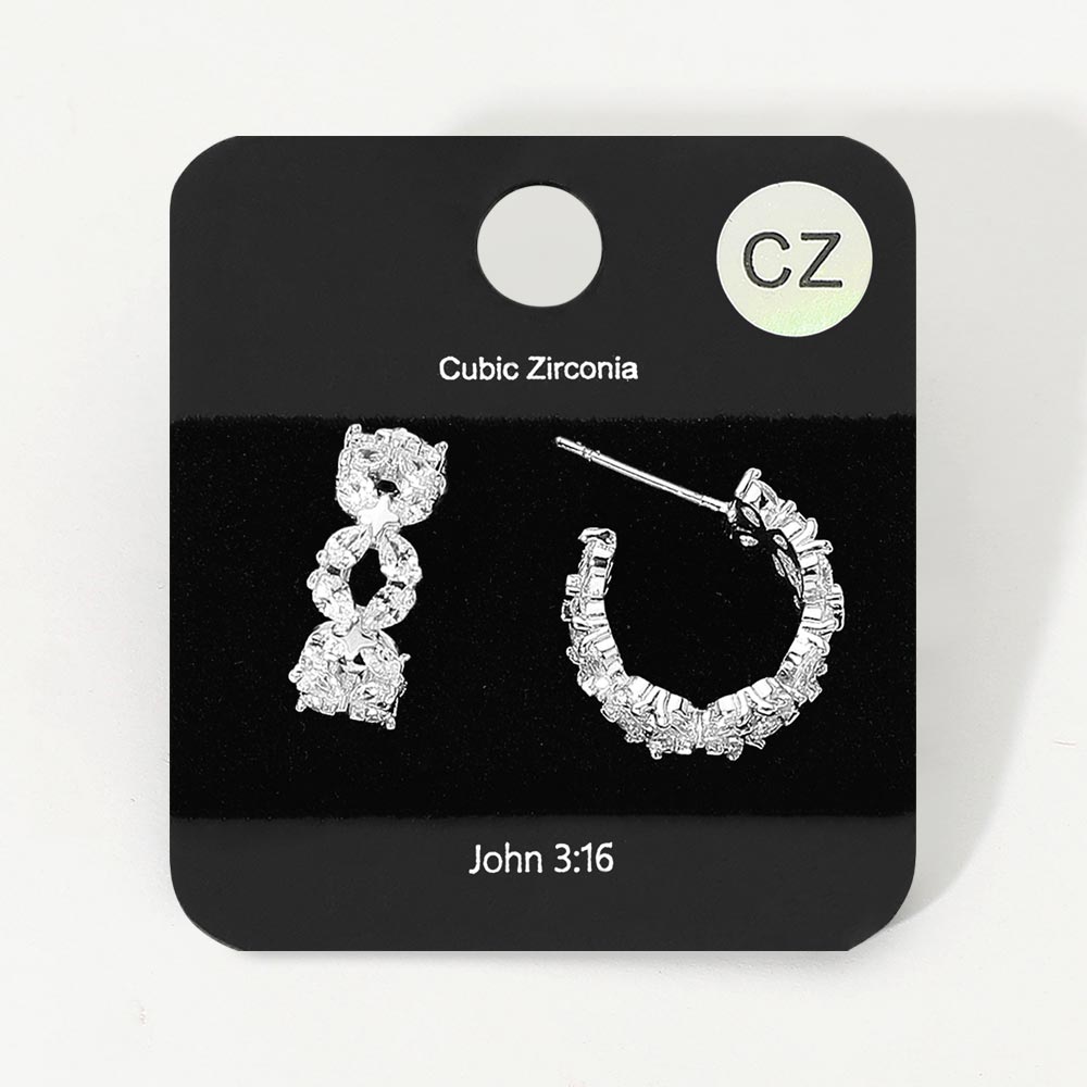 Details • Size : 0.6" X 0.6" X 0.25" • Post Back • These radiant linked cubic zirconia hoop earrings combine elegance and glamour with interlocking stone settings that create a captivating sparkle. Ideal for both formal and casual occasions, they offer a refined touch that enhances any look with modern sophistication and timeless charm. • CZ Cubic Zirconia • Lead and Nickel Compliant
