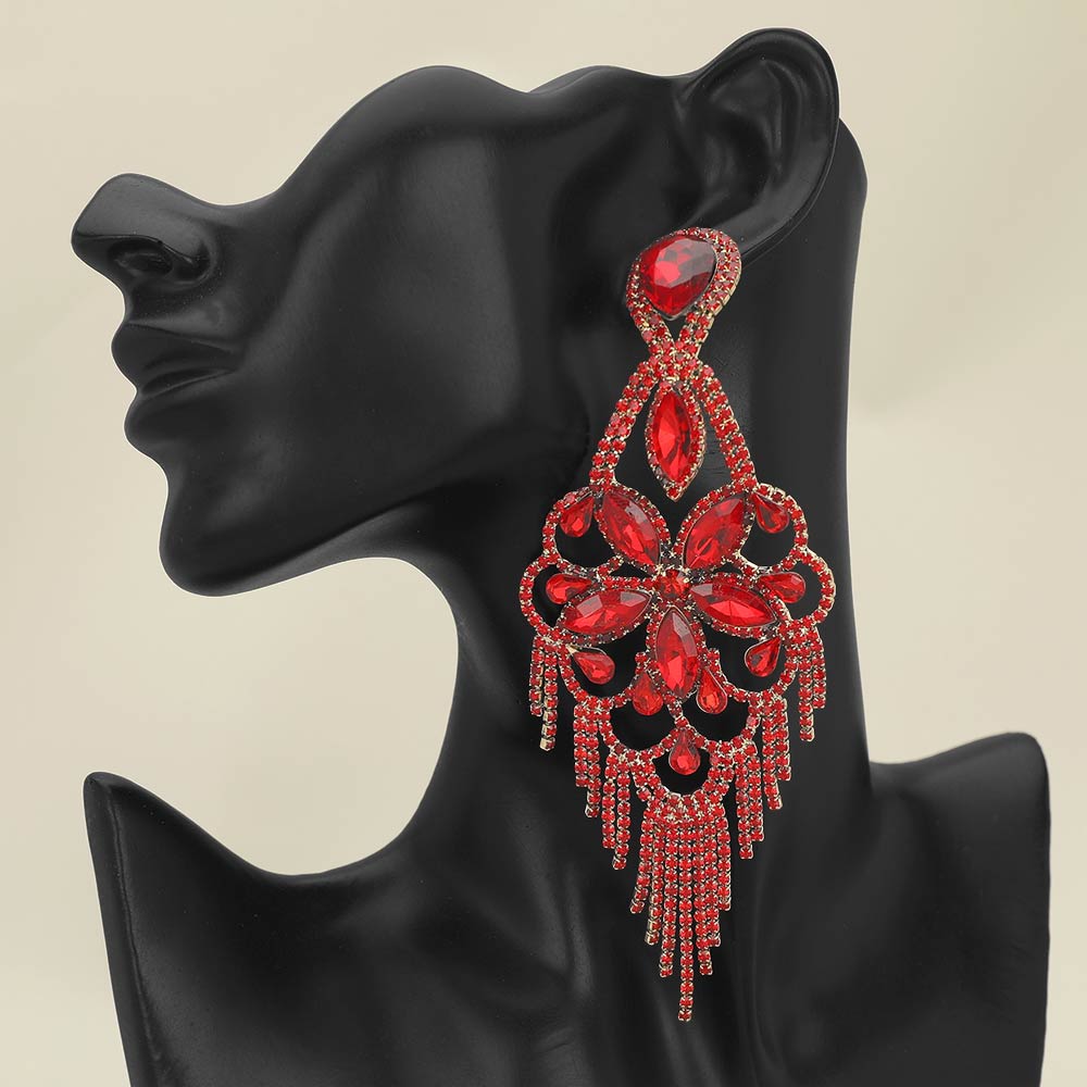 • These statement crystal fringe drop earrings feature an elegant elongated silhouette with layered detailing that creates eye-catching movement. Designed to elevate formal looks, parties, weddings, and special occasions, they offer a dramatic yet refined accent for evening wear, stage styling, and fashion-forward accessory collections.