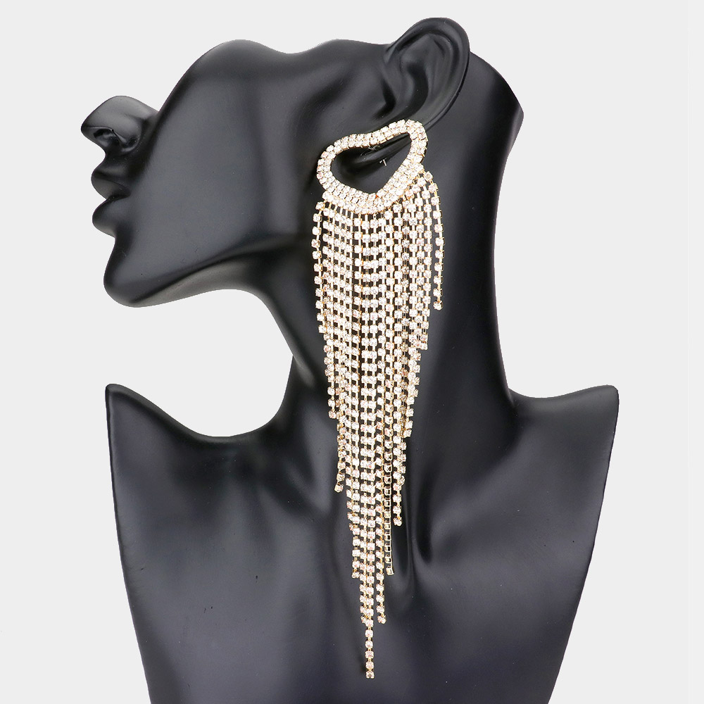 Open Heart Accented Rhinestone Fringe Dangle Evening Earrings