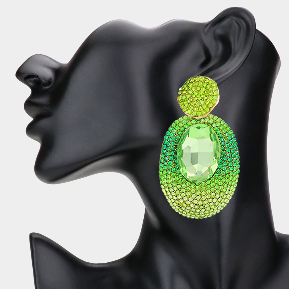 Oval Glass Stone Pointed Rhinestone Paved Dangle Evening Earrings
