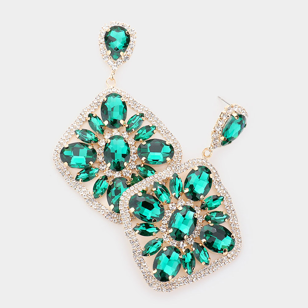Oval Marquise Stone Cluster Accented Rhinestone Rhombus Dangle Evening Earrings