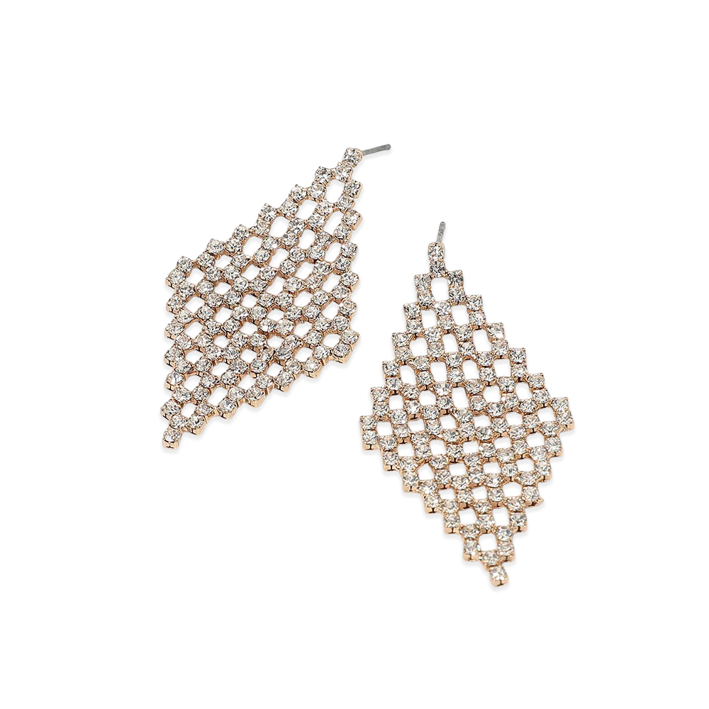 Details • Size : 1" X 2" • Post Back • Statement drop earrings featuring a bold diamond-shaped lattice design that creates eye-catching sparkle and movement. A modern, elegant silhouette ideal for evening wear, parties, and special occasions, designed to elevate outfits while offering standout appeal for trend-focused jewelry collections and boutique displays. • Lead and Nickel Compliant