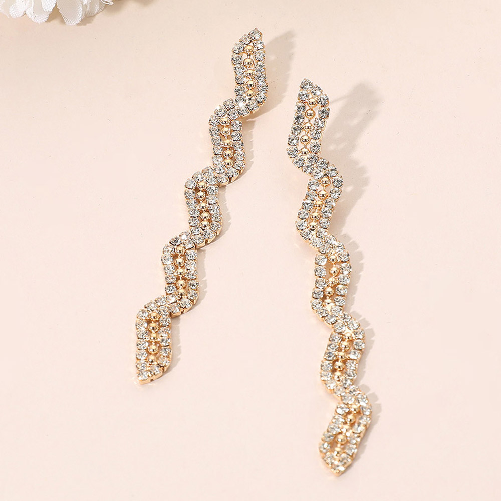 Details • Size : 0.25" X 3.4" • Post Back • These wavy crystal statement drop earrings feature a unique zigzag silhouette encrusted with brilliant stones that shimmer beautifully from every angle. Perfect for evening wear, galas, or special occasions, they add a dazzling modern touch of glamour to any sophisticated look. • Lead and Nickel Compliant