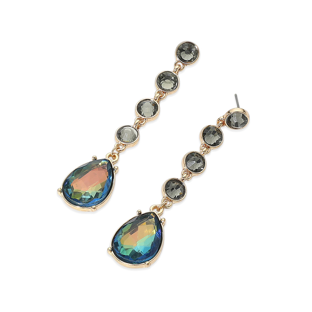 • Make a bold statement with these iridescent teardrop dangle earrings featuring gradient multicolor crystals and round accents in a sleek gold-tone setting. Lightweight and eye-catching, they’re perfect for evening events, parties, or adding a glam touch to your everyday style. A must-have accessory for trendsetters.