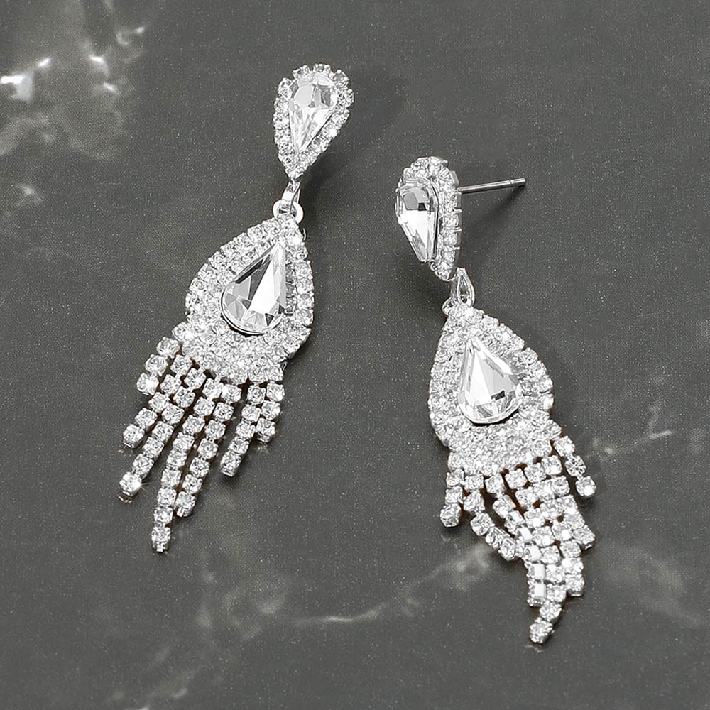 Details • Size : 0.5" X 2.25" • Post Back • Dramatic teardrop crystal fringe earrings featuring layered halos and cascading strands for a bold, sparkling finish. Their elongated silhouette adds radiant movement, making them perfect for evening events, formal occasions, weddings, or any look that calls for high-impact glamour and shine.