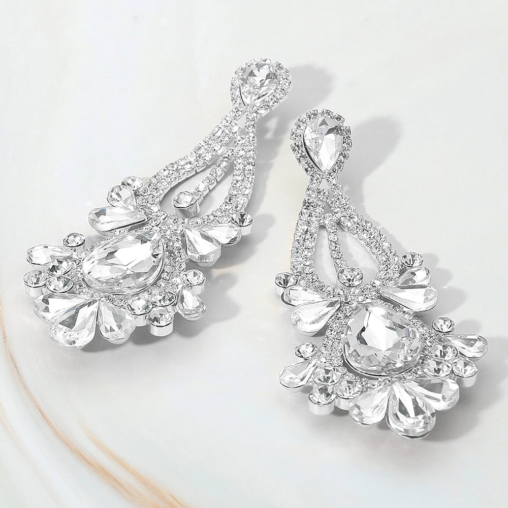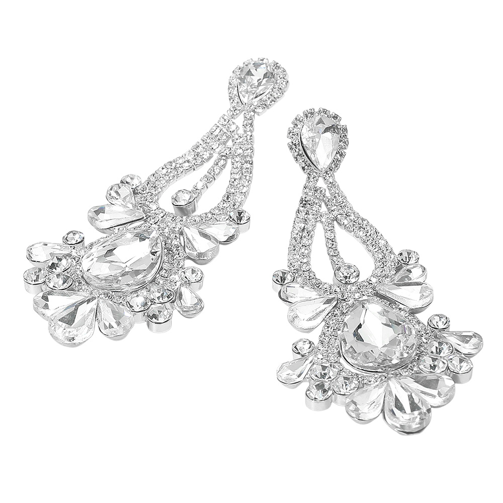 Details • Size : 1.5" X 3.1" • Post Back • Turn heads with these iridescent teardrop statement earrings, featuring a dazzling arrangement of shimmering stones and intricate detailing. Perfect for parties, weddings, and glamorous occasions, these earrings add a bold touch of sparkle and sophistication to any elegant look. • Lead and Nickel Compliant