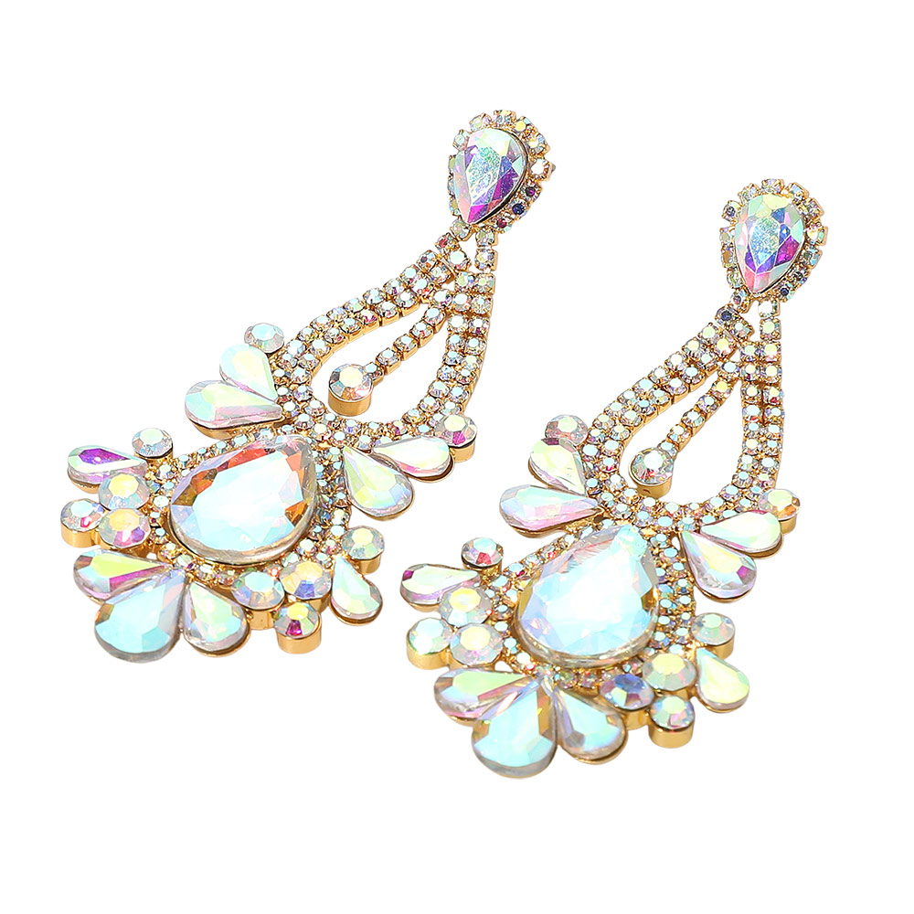 • Turn heads with these iridescent teardrop statement earrings, featuring a dazzling arrangement of shimmering stones and intricate detailing. Perfect for parties, weddings, and glamorous occasions, these earrings add a bold touch of sparkle and sophistication to any elegant look.