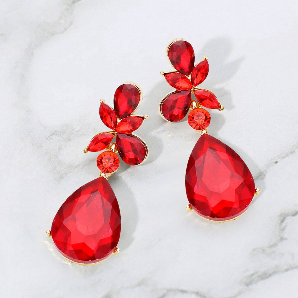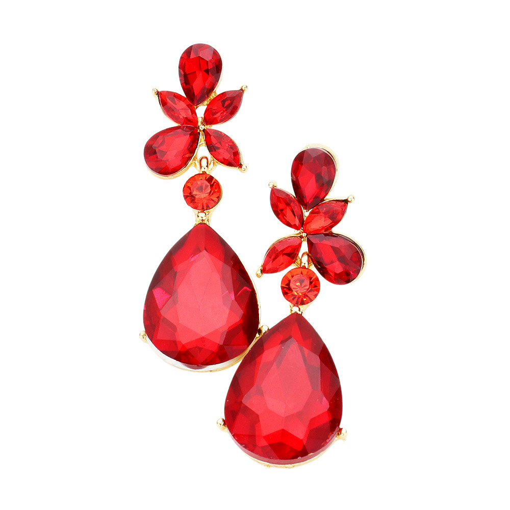 • Make a striking impression with these faceted teardrop statement earrings. Featuring bold, multi-cut stones arranged in a floral-inspired design, they capture light beautifully for a refined yet dramatic finish—perfect for evening wear or elevating any special occasion look.