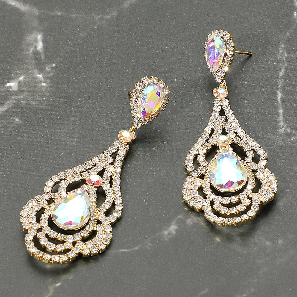 • Elegant teardrop crystal chandelier earrings with intricate layered design. Perfect for weddings, proms, and evening events, offering a dazzling statement look for any formal occasion.