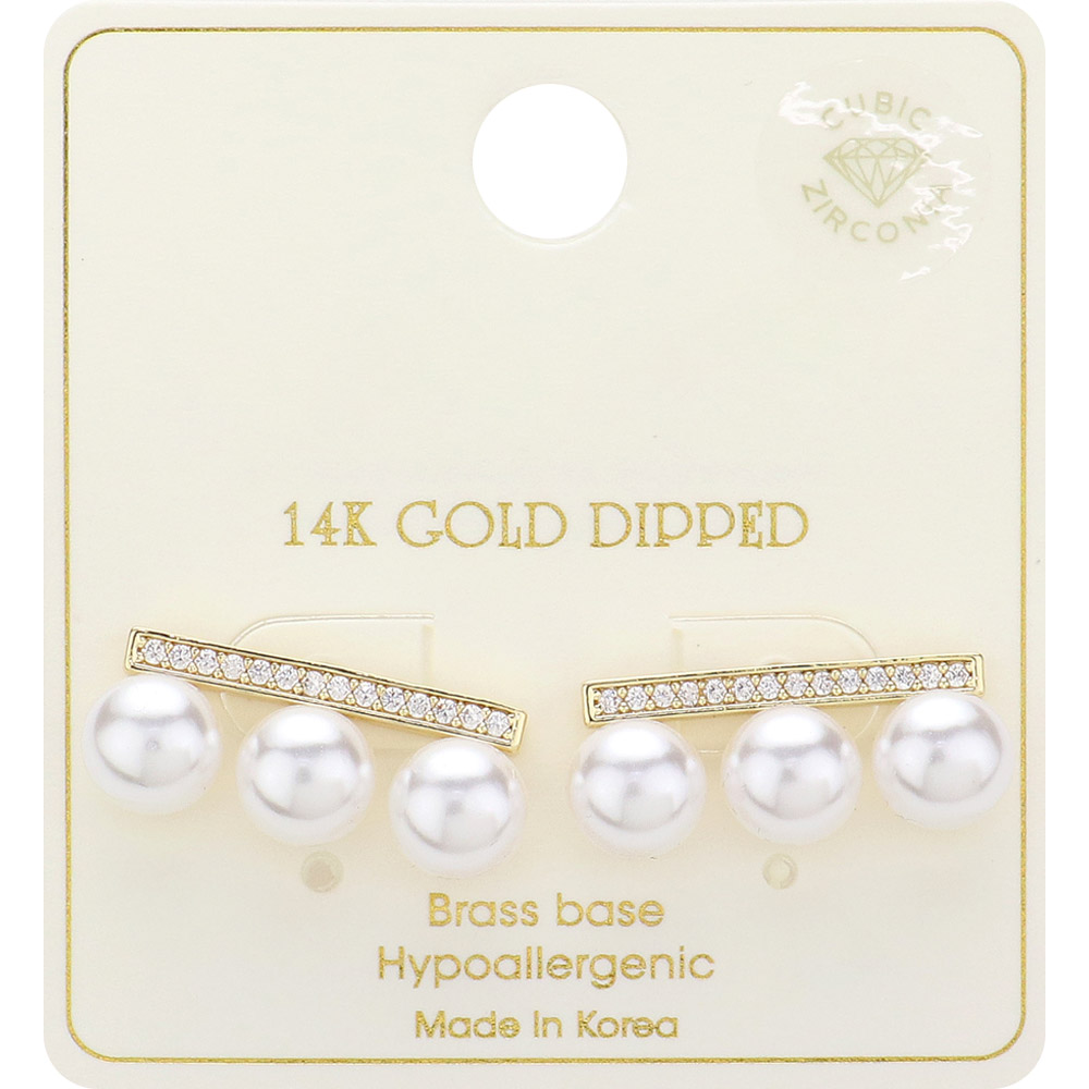 14K Gold Dipped CZ Stone Paved Bar Trio Pearl Earrings