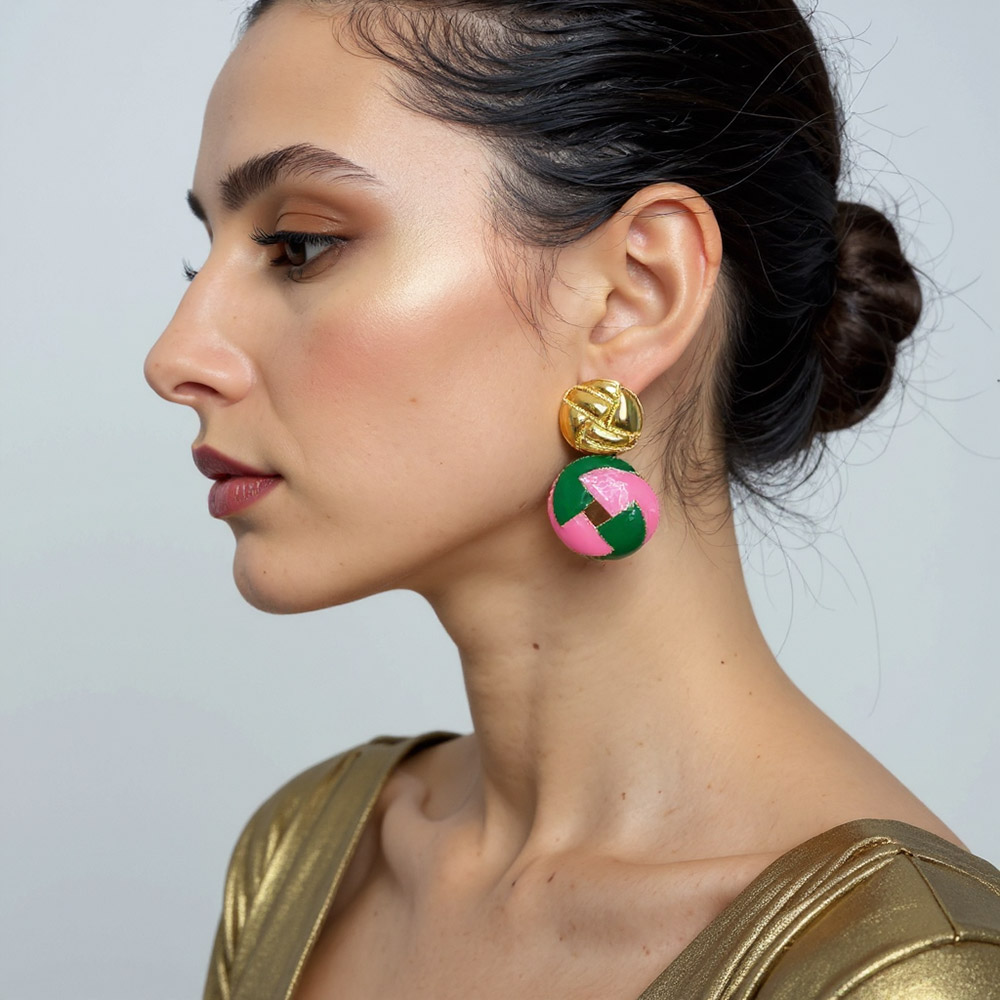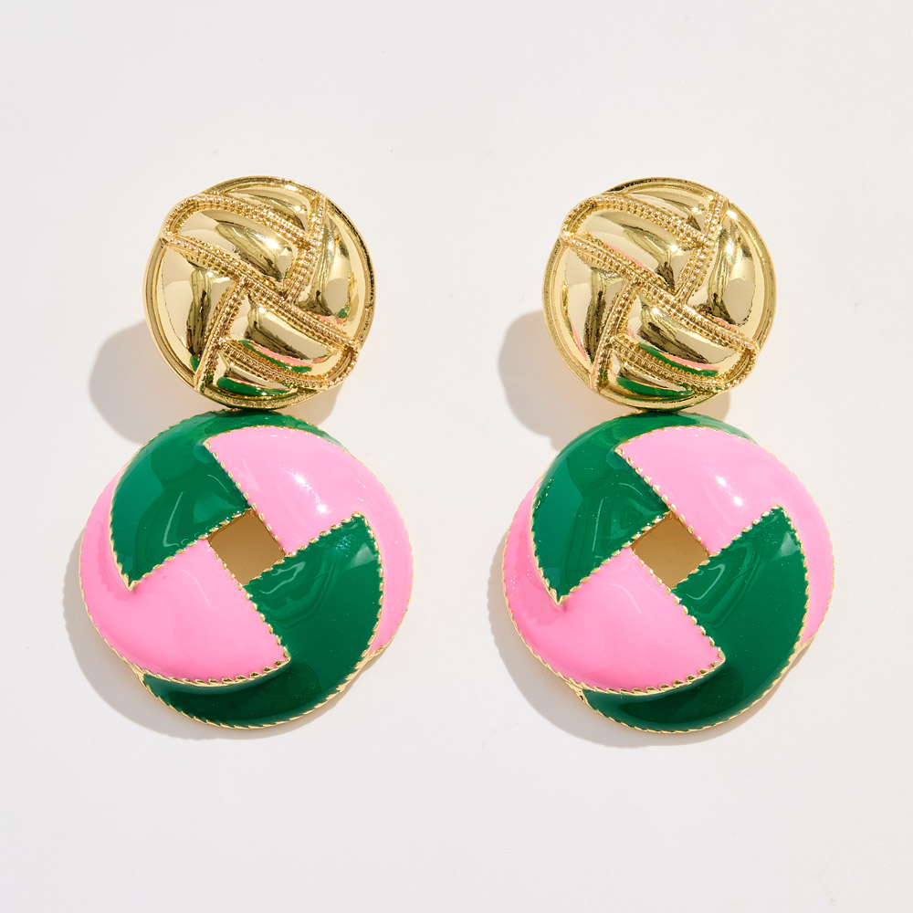 Details • Size : 1.25" X 2.1" • Post Back • Turn heads with these round enamel drop earrings, featuring a bold geometric pattern and textured accents. Lightweight yet eye-catching, they add a chic and playful vibe to both casual and dressy outfits, making them the perfect statement piece for any occasion. • Brass • Gold Dipped • Hypoallergenic • Lead and Nickel Compliant • Made In Korea