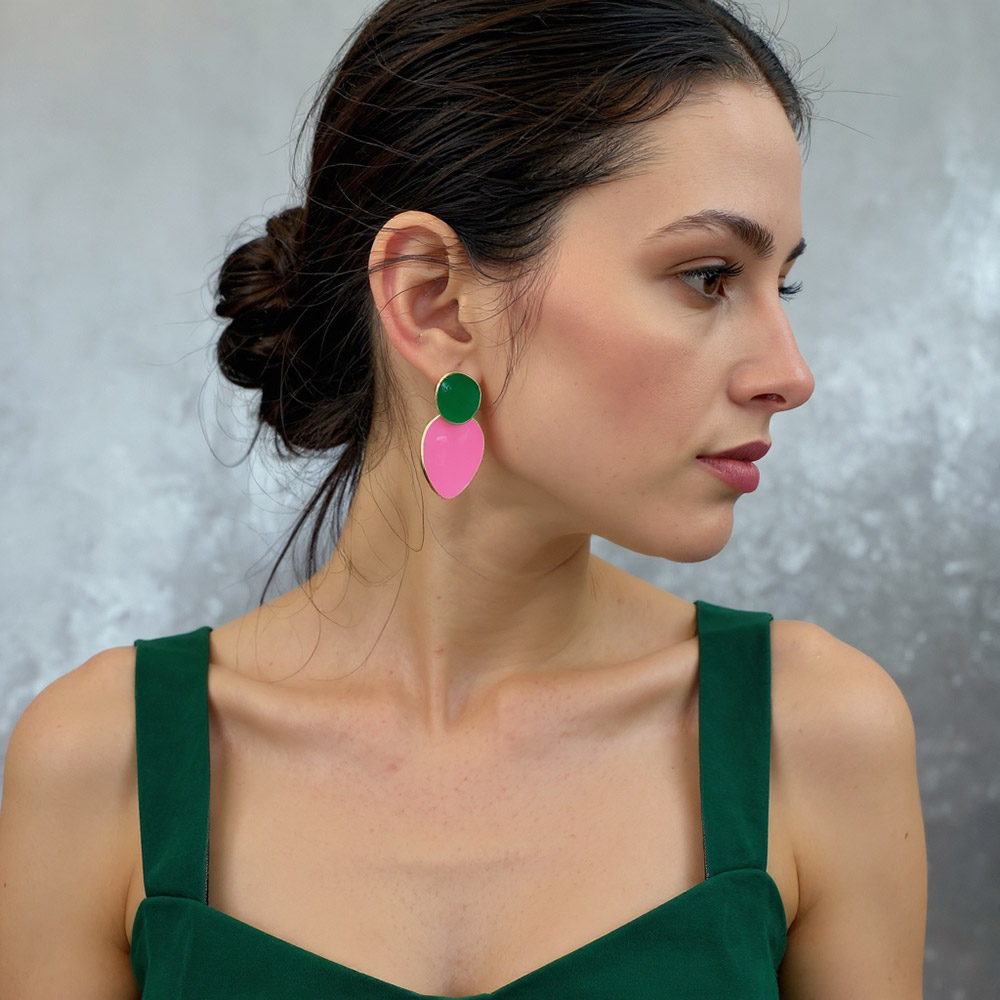 Details • Size : 0.8" X 1.6" • Post Back • Make a playful statement with these bold enamel double drop earrings, designed in contrasting tones for a fresh, modern edge. Lightweight yet striking, they bring vibrant flair to both everyday outfits and evening ensembles, perfect for trendsetters who love standout accessories. • Brass • Gold Dipped • Hypoallergenic • Lead and Nickel Compliant • Made In Korea