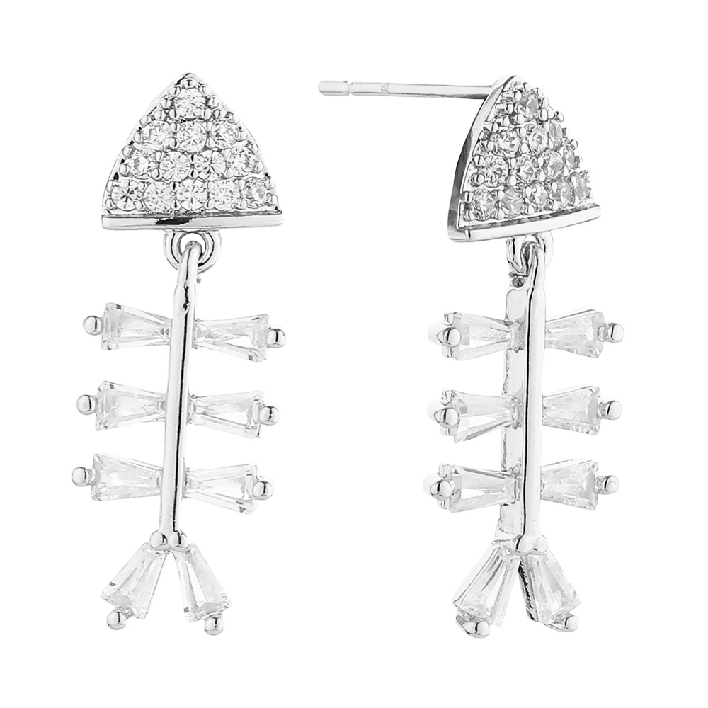14K White Gold Dipped CZ Stone Paved Fish Bone Earrings