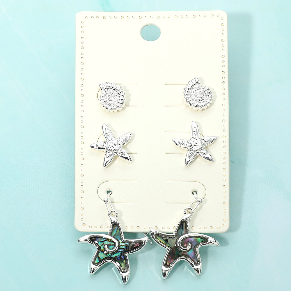 Details • Size : 0.4" - 1.3" L • Post Back, Fish Hook Back • Three-pair starfish-themed earring set featuring textured stud designs, dimensional star accents, and dangling starfish styles. Perfect for mix-and-match wear, coastal looks, vacations, and everyday styling. A versatile accessory set ideal for gift displays, seasonal collections, and trend-focused jewelry assortments. • Lead and Nickel Compliant