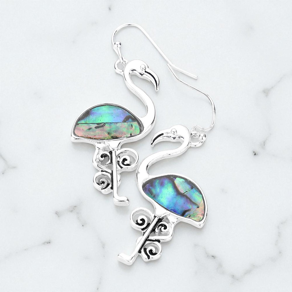 Abalone Accented Antique Metal Flamingo Dangle Earrings